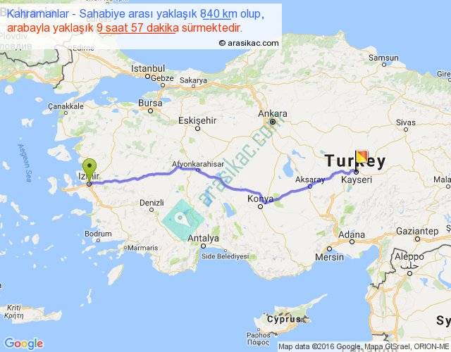 Kahramanlar - Sahabiye arası yaklaşık olarak 90 km/h ile yukarıda belirtilen sürede olup, iki yerin kuş uçuşu uzaklığı (mesafesi) 721'dir. Eğer belirtilen yerler arasında uçak seferi var ise bu süre uçakla 1 saat 06 dakika'ya kadar düşebilir. Yolculuk otobüsle 12 saat 56 dakika sürmektedir.