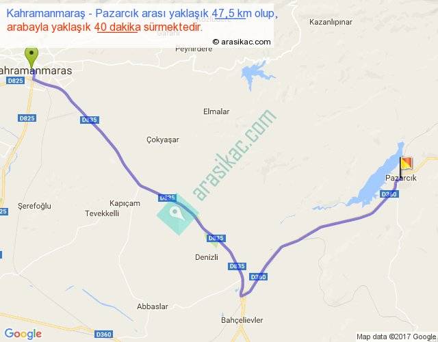 Kahramanmaraş - Pazarcık arası yaklaşık olarak 90 km/h ile yukarıda belirtilen sürede olup, iki yerin kuş uçuşu uzaklığı (mesafesi) 34'dir. Yolculuk otobüsle 52 dakika sürmektedir.
