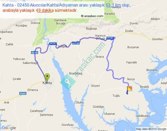 Kahta - 02450 Akıncılar Kahta Adıyaman arası yaklaşık olarak 90 km/h ile yukarıda belirtilen sürede olup, iki yerin kuş uçuşu uzaklığı (mesafesi) 19'dir. Yolculuk otobüsle 1 saat 3 dakika sürmektedir.