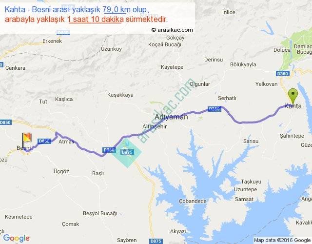 Kahta - Besni arası yaklaşık olarak 90 km/h ile yukarıda belirtilen sürede olup, iki yerin kuş uçuşu uzaklığı (mesafesi) 67'dir. Yolculuk otobüsle 1 saat 31 dakika sürmektedir.