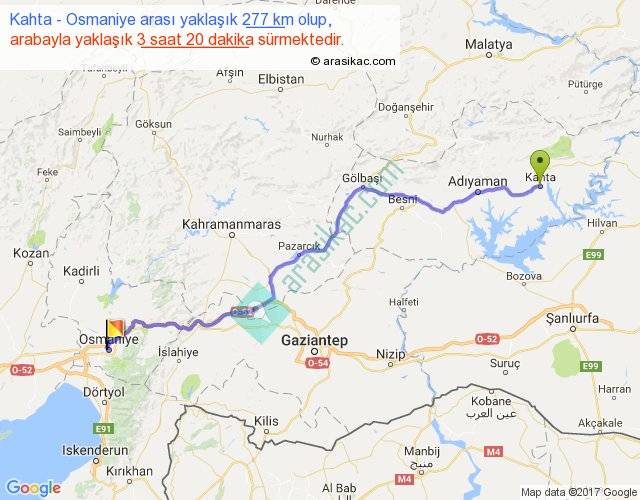 Kahta - Osmaniye arası yaklaşık olarak 90 km/h ile yukarıda belirtilen sürede olup, iki yerin kuş uçuşu uzaklığı (mesafesi) 223'dir. Yolculuk otobüsle 4 saat 20 dakika sürmektedir.