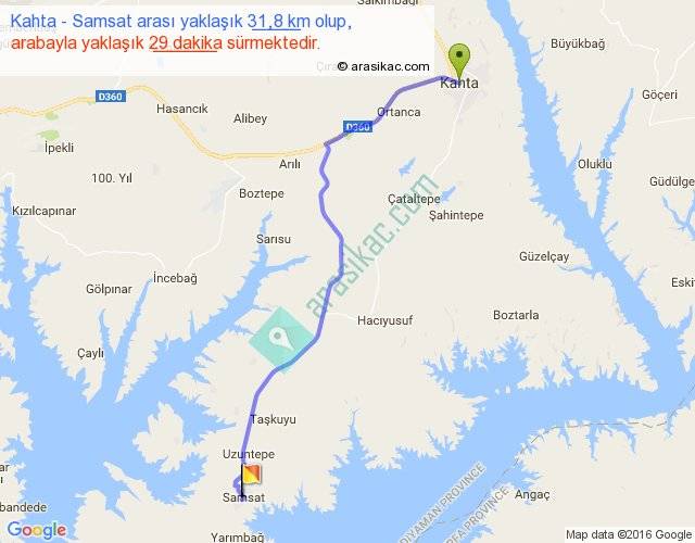 Kahta - Samsat arası yaklaşık olarak 90 km/h ile yukarıda belirtilen sürede olup, iki yerin kuş uçuşu uzaklığı (mesafesi) 26'dir. Yolculuk otobüsle 37 dakika sürmektedir.