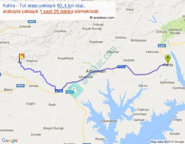 Kahta - Tut arası yaklaşık olarak 90 km/h ile yukarıda belirtilen sürede olup, iki yerin kuş uçuşu uzaklığı (mesafesi) 62'dir. Yolculuk otobüsle 1 saat 51 dakika sürmektedir.