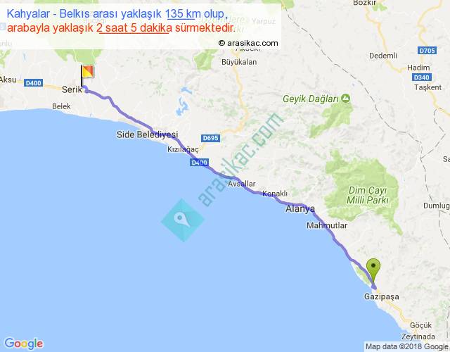 Kahyalar - Belkıs arası yaklaşık olarak 90 km/h ile yukarıda belirtilen sürede olup, iki yerin kuş uçuşu uzaklığı (mesafesi) 122'dir. Yolculuk otobüsle 2 saat 42 dakika sürmektedir.