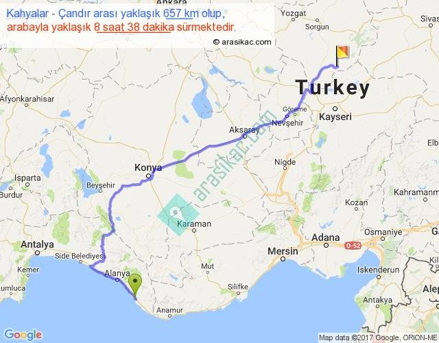 Kahyalar - Çandır arası yaklaşık olarak 90 km/h ile yukarıda belirtilen sürede olup, iki yerin kuş uçuşu uzaklığı (mesafesi) 430'dir. Eğer belirtilen yerler arasında uçak seferi var ise bu süre uçakla 39 dakika'ya kadar düşebilir. Yolculuk otobüsle 11 saat 13 dakika sürmektedir.