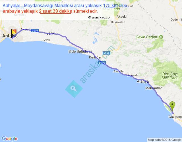 Kahyalar - Meydankavağı Mahallesi arası yaklaşık olarak 90 km/h ile yukarıda belirtilen sürede olup, iki yerin kuş uçuşu uzaklığı (mesafesi) 151'dir. Yolculuk otobüsle 3 saat 26 dakika sürmektedir.