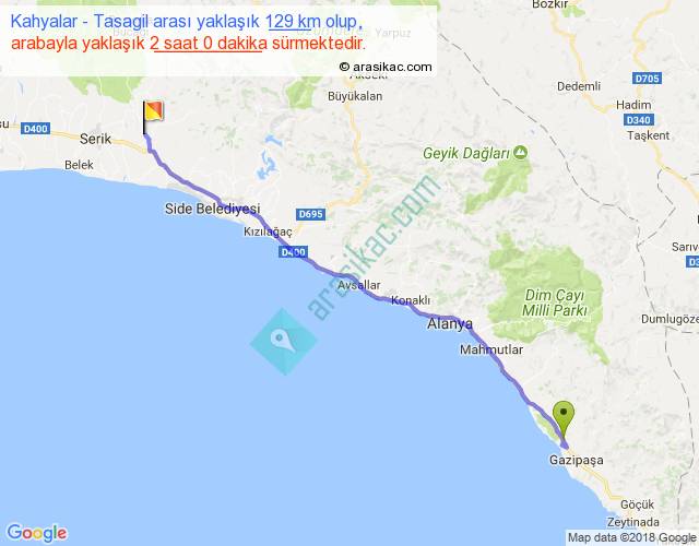 Kahyalar - Tasagil arası yaklaşık olarak 90 km/h ile yukarıda belirtilen sürede olup, iki yerin kuş uçuşu uzaklığı (mesafesi) 116'dir. Yolculuk otobüsle 2 saat 36 dakika sürmektedir.