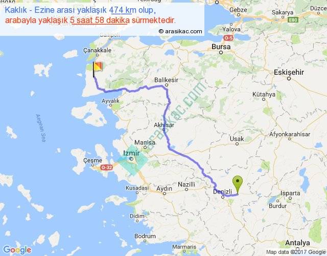 Kaklık - Ezine arası yaklaşık olarak 90 km/h ile yukarıda belirtilen sürede olup, iki yerin kuş uçuşu uzaklığı (mesafesi) 342'dir. Eğer belirtilen yerler arasında uçak seferi var ise bu süre uçakla 31 dakika'ya kadar düşebilir. Yolculuk otobüsle 7 saat 45 dakika sürmektedir.