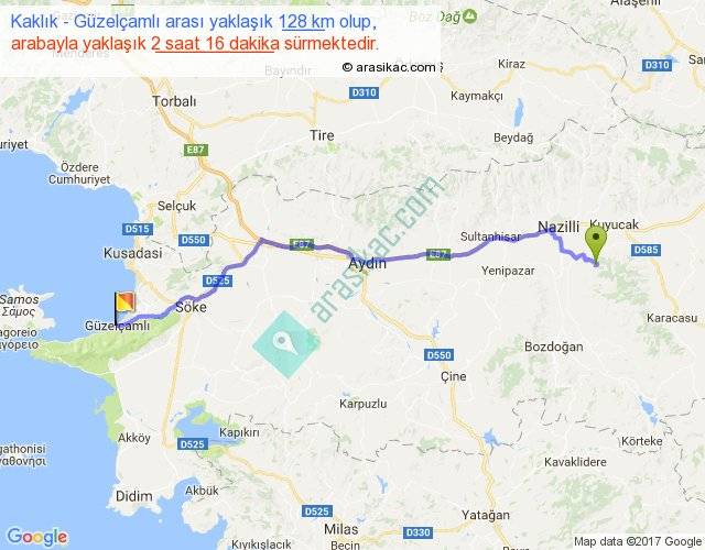 Kaklık - Güzelçamlı arası yaklaşık olarak 90 km/h ile yukarıda belirtilen sürede olup, iki yerin kuş uçuşu uzaklığı (mesafesi) 105'dir. Yolculuk otobüsle 2 saat 56 dakika sürmektedir.