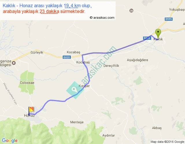 Kaklık - Honaz arası yaklaşık olarak 90 km/h ile yukarıda belirtilen sürede olup, iki yerin kuş uçuşu uzaklığı (mesafesi) 16'dir. Yolculuk otobüsle 29 dakika sürmektedir.