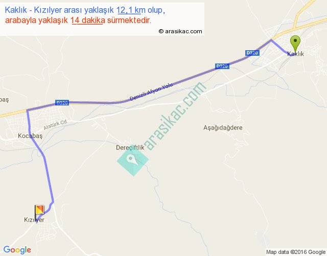 Kaklık - Kızılyer arası yaklaşık olarak 90 km/h ile yukarıda belirtilen sürede olup, iki yerin kuş uçuşu uzaklığı (mesafesi) 9'dir. Yolculuk otobüsle 18 dakika sürmektedir.