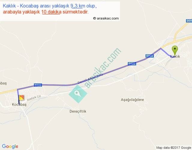 Kaklık - Kocabaş arası yaklaşık olarak 90 km/h ile yukarıda belirtilen sürede olup, iki yerin kuş uçuşu uzaklığı (mesafesi) 8'dir. Yolculuk otobüsle 13 dakika sürmektedir.
