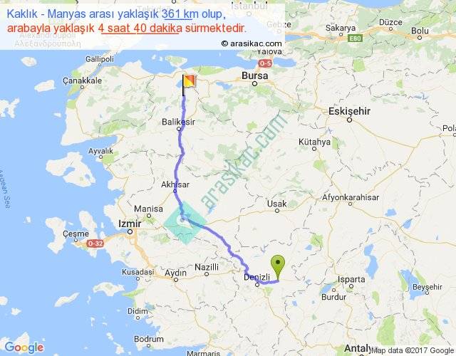 Kaklık - Manyas arası yaklaşık olarak 90 km/h ile yukarıda belirtilen sürede olup, iki yerin kuş uçuşu uzaklığı (mesafesi) 275'dir. Eğer belirtilen yerler arasında uçak seferi var ise bu süre uçakla 25 dakika'ya kadar düşebilir. Yolculuk otobüsle 6 saat 4 dakika sürmektedir.