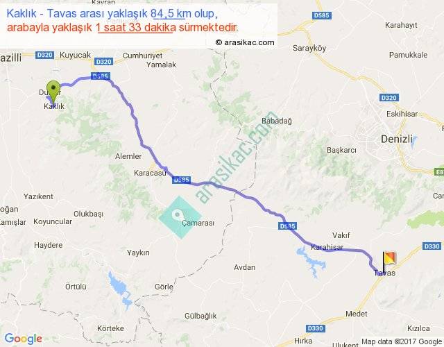 Kaklık - Tavas arası yaklaşık olarak 90 km/h ile yukarıda belirtilen sürede olup, iki yerin kuş uçuşu uzaklığı (mesafesi) 64'dir. Yolculuk otobüsle 2 saat 0 dakika sürmektedir.