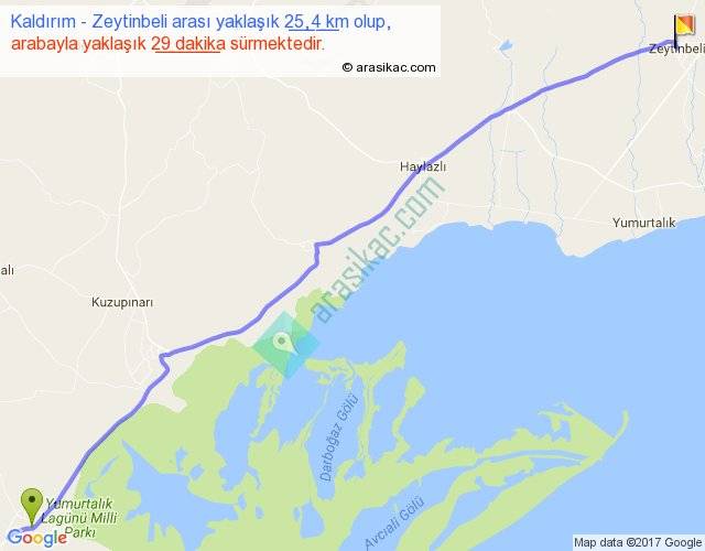 Kaldırım - Zeytinbeli arası yaklaşık olarak 90 km/h ile yukarıda belirtilen sürede olup, iki yerin kuş uçuşu uzaklığı (mesafesi) 22'dir. Yolculuk otobüsle 37 dakika sürmektedir.