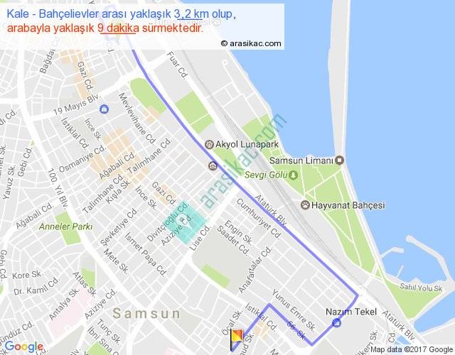 Kale - Bahçelievler arası yaklaşık olarak 90 km/h ile yukarıda belirtilen sürede olup, iki yerin kuş uçuşu uzaklığı (mesafesi) 2'dir. Yolculuk otobüsle 11 dakika sürmektedir.