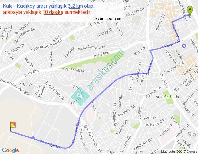 Kale - Kadıköy arası yaklaşık olarak 90 km/h ile yukarıda belirtilen sürede olup, iki yerin kuş uçuşu uzaklığı (mesafesi) 2'dir. Yolculuk otobüsle 13 dakika sürmektedir.