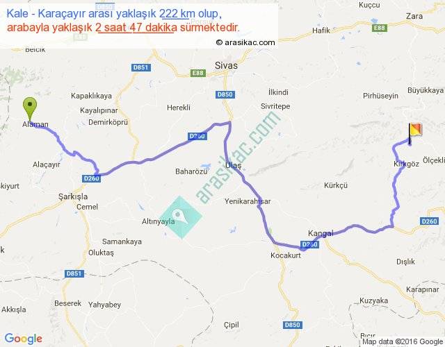 Kale - Karaçayır arası yaklaşık olarak 90 km/h ile yukarıda belirtilen sürede olup, iki yerin kuş uçuşu uzaklığı (mesafesi) 128'dir. Yolculuk otobüsle 3 saat 37 dakika sürmektedir.