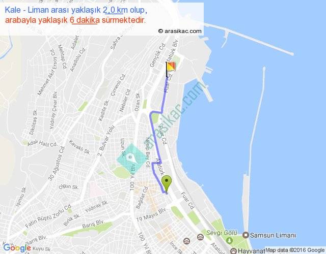 Kale - Liman arası yaklaşık olarak 90 km/h ile yukarıda belirtilen sürede olup, iki yerin kuş uçuşu uzaklığı (mesafesi) 2'dir. Yolculuk otobüsle 7 dakika sürmektedir.
