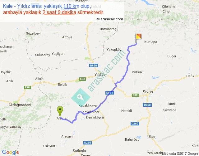 Kale - Yıldız arası yaklaşık olarak 90 km/h ile yukarıda belirtilen sürede olup, iki yerin kuş uçuşu uzaklığı (mesafesi) 80'dir. Yolculuk otobüsle 2 saat 47 dakika sürmektedir.