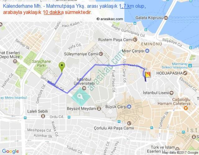 Kalenderhane Mh. - Mahmutpaşa Ykş. arası yaklaşık olarak 90 km/h ile yukarıda belirtilen sürede olup, iki yerin kuş uçuşu uzaklığı (mesafesi) 1'dir. Yolculuk otobüsle 13 dakika sürmektedir.