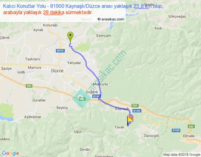 Kalıcı Konutlar Yolu - 81900 Kaynaşlı Düzce arası yaklaşık olarak 90 km/h ile yukarıda belirtilen sürede olup, iki yerin kuş uçuşu uzaklığı (mesafesi) 18'dir. Yolculuk otobüsle 36 dakika sürmektedir.