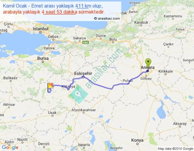 Kamil Ocak - Emet arası yaklaşık olarak 90 km/h ile yukarıda belirtilen sürede olup, iki yerin kuş uçuşu uzaklığı (mesafesi) 316'dir. Eğer belirtilen yerler arasında uçak seferi var ise bu süre uçakla 29 dakika'ya kadar düşebilir. Yolculuk otobüsle 6 saat 20 dakika sürmektedir.