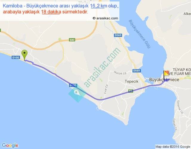 Kamiloba - Büyükçekmece arası yaklaşık olarak 90 km/h ile yukarıda belirtilen sürede olup, iki yerin kuş uçuşu uzaklığı (mesafesi) 14'dir. Yolculuk otobüsle 23 dakika sürmektedir.
