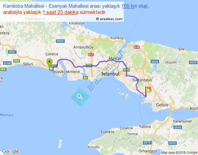 Kamiloba Mahallesi - Esenyalı Mahallesi arası yaklaşık olarak 90 km/h ile yukarıda belirtilen sürede olup, iki yerin kuş uçuşu uzaklığı (mesafesi) 74'dir. Yolculuk otobüsle 1 saat 47 dakika sürmektedir.