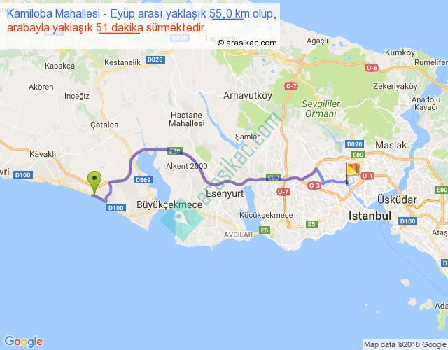 Kamiloba Mahallesi - Eyüp arası yaklaşık olarak 90 km/h ile yukarıda belirtilen sürede olup, iki yerin kuş uçuşu uzaklığı (mesafesi) 41'dir. Yolculuk otobüsle 1 saat 6 dakika sürmektedir.