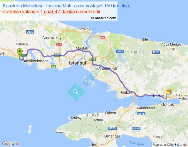 Kamiloba Mahallesi - İbnisina Mah. arası yaklaşık olarak 90 km/h ile yukarıda belirtilen sürede olup, iki yerin kuş uçuşu uzaklığı (mesafesi) 119'dir. Yolculuk otobüsle 2 saat 19 dakika sürmektedir.