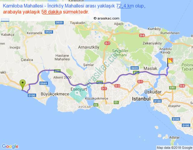 Kamiloba Mahallesi - İncirköy Mahallesi arası yaklaşık olarak 90 km/h ile yukarıda belirtilen sürede olup, iki yerin kuş uçuşu uzaklığı (mesafesi) 56'dir. Yolculuk otobüsle 1 saat 15 dakika sürmektedir.