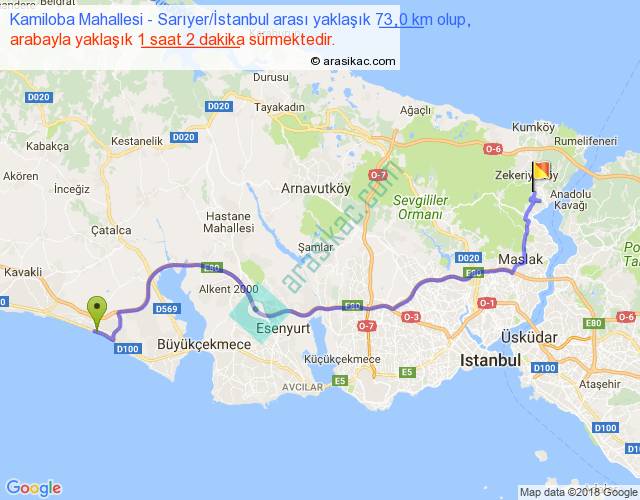Kamiloba Mahallesi - Sarıyer İstanbul arası yaklaşık olarak 90 km/h ile yukarıda belirtilen sürede olup, iki yerin kuş uçuşu uzaklığı (mesafesi) 53'dir. Yolculuk otobüsle 1 saat 20 dakika sürmektedir.