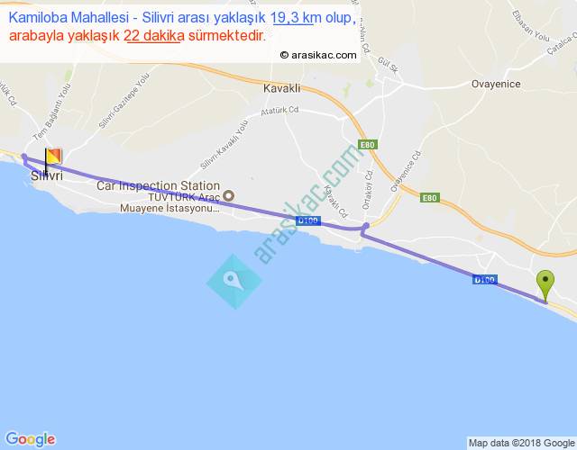 Kamiloba Mahallesi - Silivri arası yaklaşık olarak 90 km/h ile yukarıda belirtilen sürede olup, iki yerin kuş uçuşu uzaklığı (mesafesi) 16'dir. Yolculuk otobüsle 28 dakika sürmektedir.