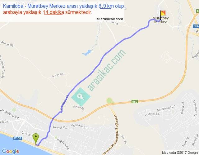 Kamiloba - Muratbey Merkez arası yaklaşık olarak 90 km/h ile yukarıda belirtilen sürede olup, iki yerin kuş uçuşu uzaklığı (mesafesi) 8'dir. Yolculuk otobüsle 18 dakika sürmektedir.