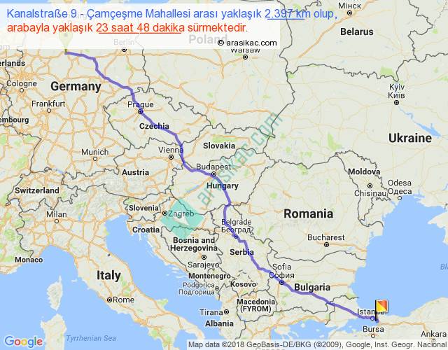 Kanalstraße 9 - Çamçeşme Mahallesi arası yaklaşık olarak 90 km/h ile yukarıda belirtilen sürede olup, iki yerin kuş uçuşu uzaklığı (mesafesi) 1943'dir. Eğer belirtilen yerler arasında uçak seferi var ise bu süre uçakla 2 saat 59 dakika'ya kadar düşebilir. Yolculuk otobüsle 1 gün 6 saat sürmektedir.
