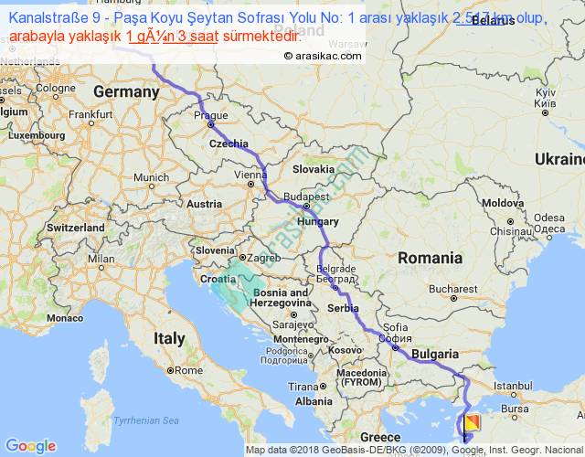 Kanalstraße 9 - Paşa Koyu Şeytan Sofrası Yolu No: 1 arası yaklaşık olarak 90 km/h ile yukarıda belirtilen sürede olup, iki yerin kuş uçuşu uzaklığı (mesafesi) 1939'dir. Eğer belirtilen yerler arasında uçak seferi var ise bu süre uçakla 2 saat 58 dakika'ya kadar düşebilir. Yolculuk otobüsle 1 gün 11 saat sürmektedir.