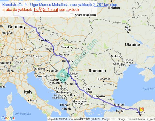 Kanalstraße 9 - Uğur Mumcu Mahallesi arası yaklaşık olarak 90 km/h ile yukarıda belirtilen sürede olup, iki yerin kuş uçuşu uzaklığı (mesafesi) 2217'dir. Eğer belirtilen yerler arasında uçak seferi var ise bu süre uçakla 3 saat 24 dakika'ya kadar düşebilir. Yolculuk otobüsle 1 gün 12 saat sürmektedir.