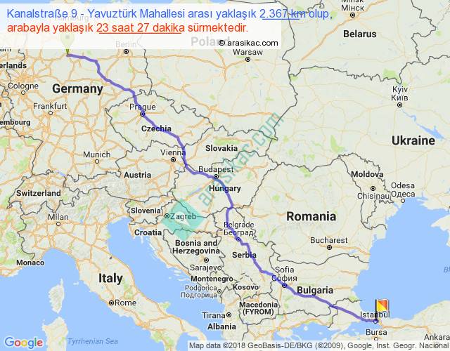 Kanalstraße 9 - Yavuztürk Mahallesi arası yaklaşık olarak 90 km/h ile yukarıda belirtilen sürede olup, iki yerin kuş uçuşu uzaklığı (mesafesi) 1918'dir. Eğer belirtilen yerler arasında uçak seferi var ise bu süre uçakla 2 saat 57 dakika'ya kadar düşebilir. Yolculuk otobüsle 1 gün 6 saat sürmektedir.