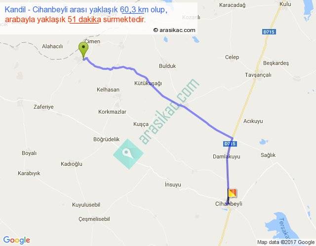 Kandil - Cihanbeyli arası yaklaşık olarak 90 km/h ile yukarıda belirtilen sürede olup, iki yerin kuş uçuşu uzaklığı (mesafesi) 49'dir. Yolculuk otobüsle 1 saat 6 dakika sürmektedir.