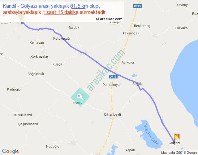 Kandil - Gölyazı arası yaklaşık olarak 90 km/h ile yukarıda belirtilen sürede olup, iki yerin kuş uçuşu uzaklığı (mesafesi) 74'dir. Yolculuk otobüsle 1 saat 37 dakika sürmektedir.