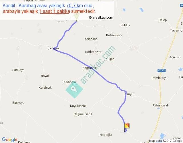 Kandil - Karabağ arası yaklaşık olarak 90 km/h ile yukarıda belirtilen sürede olup, iki yerin kuş uçuşu uzaklığı (mesafesi) 50'dir. Yolculuk otobüsle 1 saat 19 dakika sürmektedir.
