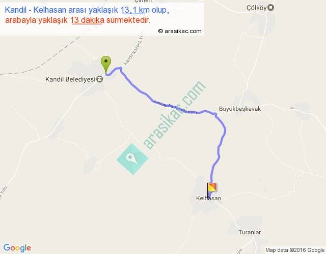 Kandil - Kelhasan arası yaklaşık olarak 90 km/h ile yukarıda belirtilen sürede olup, iki yerin kuş uçuşu uzaklığı (mesafesi) 9'dir. Yolculuk otobüsle 16 dakika sürmektedir.