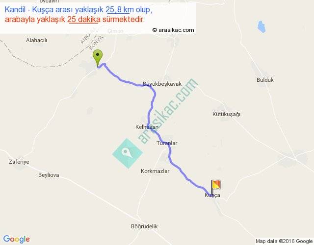 Kandil - Kuşça arası yaklaşık olarak 90 km/h ile yukarıda belirtilen sürede olup, iki yerin kuş uçuşu uzaklığı (mesafesi) 21'dir. Yolculuk otobüsle 32 dakika sürmektedir.
