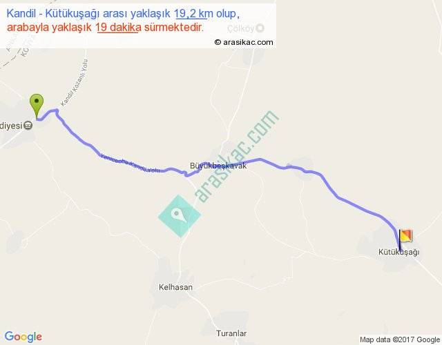 Kandil - Kütükuşağı arası yaklaşık olarak 90 km/h ile yukarıda belirtilen sürede olup, iki yerin kuş uçuşu uzaklığı (mesafesi) 17'dir. Yolculuk otobüsle 24 dakika sürmektedir.