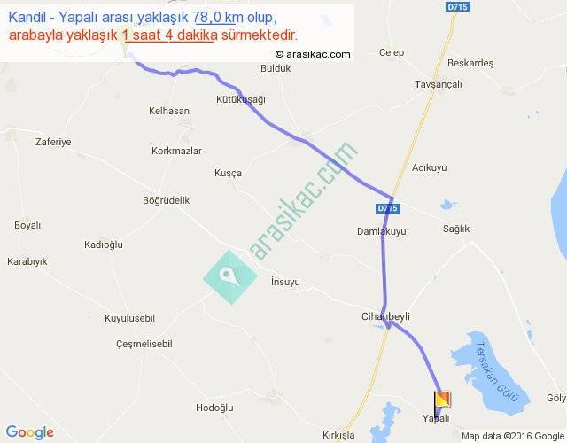 Kandil - Yapalı arası yaklaşık olarak 90 km/h ile yukarıda belirtilen sürede olup, iki yerin kuş uçuşu uzaklığı (mesafesi) 64'dir. Yolculuk otobüsle 1 saat 23 dakika sürmektedir.