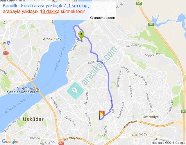 Kandilli - Ferah arası yaklaşık olarak 90 km/h ile yukarıda belirtilen sürede olup, iki yerin kuş uçuşu uzaklığı (mesafesi) 4'dir. Yolculuk otobüsle 23 dakika sürmektedir.