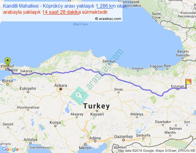 Kandilli Mahallesi - Köprüköy arası yaklaşık olarak 90 km/h ile yukarıda belirtilen sürede olup, iki yerin kuş uçuşu uzaklığı (mesafesi) 1082'dir. Eğer belirtilen yerler arasında uçak seferi var ise bu süre uçakla 1 saat 39 dakika'ya kadar düşebilir. Yolculuk otobüsle 18 saat 48 dakika sürmektedir.