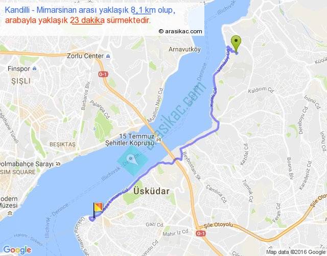 Eğer Kandilli Mimarsinan arası ne kadar yakar (benzin/mazot) diyorsanız, kilometrede 3 ₺ yakan bir aracınız var ise 24, km'de 4 ₺ yakan bir aracınız var ise 32, km'de 5 ₺ yakan bir aracınız var ise 40 ile bu yolculuğu tamamlayabilirsiniz.