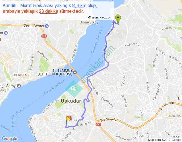 Kandilli - Murat Reis arası yaklaşık olarak 90 km/h ile yukarıda belirtilen sürede olup, iki yerin kuş uçuşu uzaklığı (mesafesi) 6'dir. Yolculuk otobüsle 29 dakika sürmektedir.
